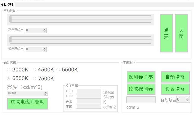 系統(tǒng)軟件界面如下圖。軟件界面清晰直觀,可手動調(diào)節(jié)LED的電流大小,也可按照步數(shù)輸入期望的數(shù)值,實(shí)現(xiàn)精細(xì)調(diào)節(jié),實(shí)際調(diào)節(jié)精度遠(yuǎn)大于2星等。