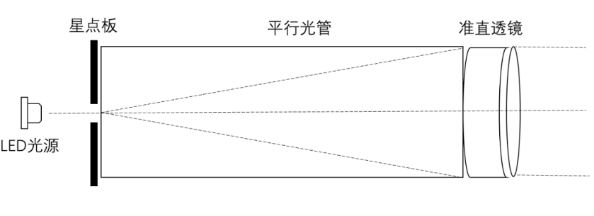 星光模擬器由LED光源,星點(diǎn)板,平行光管,準(zhǔn)直透鏡,驅(qū)動電源,控制軟件等組成。通過調(diào)節(jié)LED的驅(qū)動電流實(shí)現(xiàn)不同級別的亮度輸出,從而實(shí)現(xiàn)不同星等亮度要求。