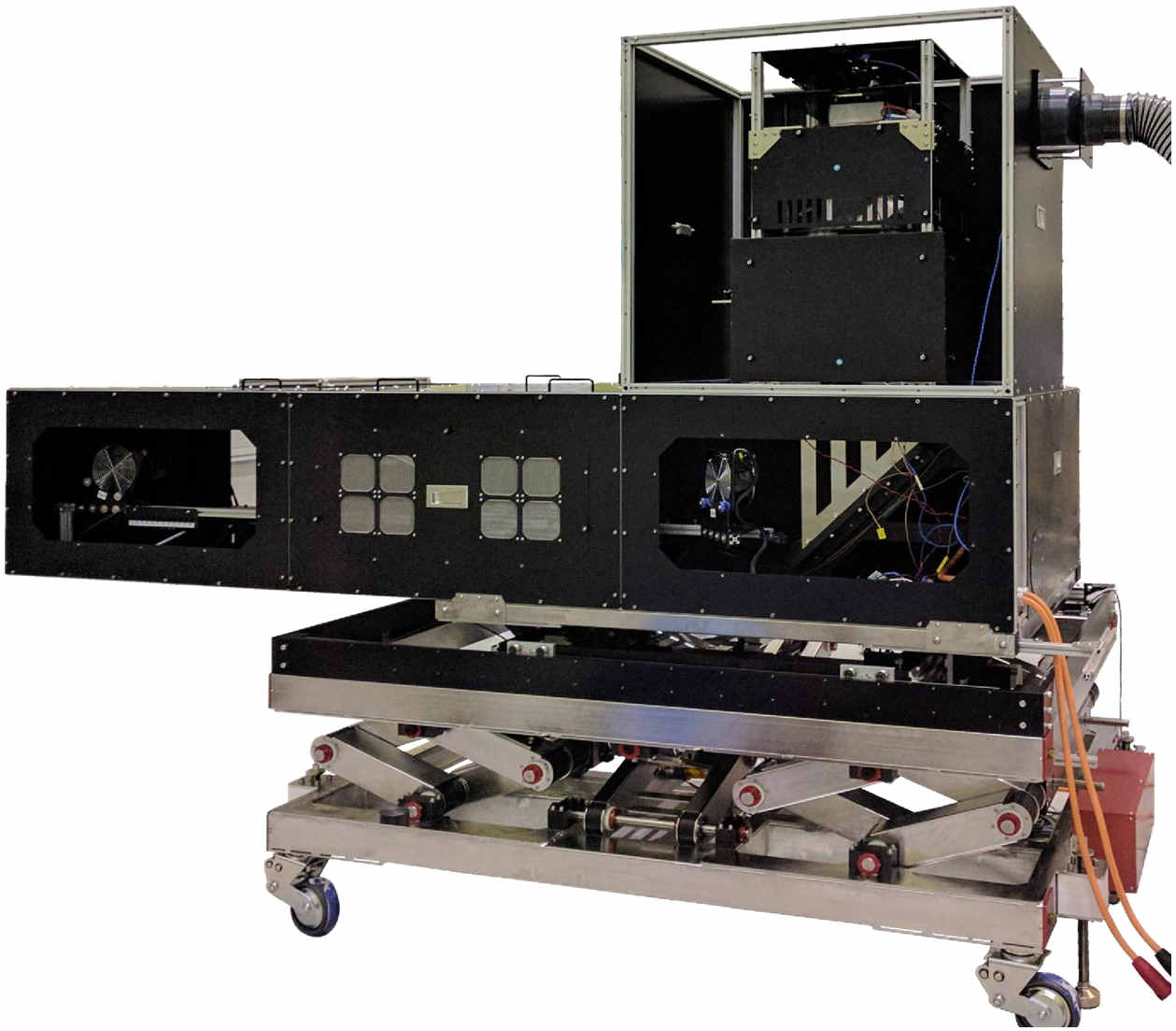 我們的客戶(hù)需要整個(gè)太陽(yáng)能模擬器在5個(gè)軸(X,Y和Z)以及2個(gè)旋轉(zhuǎn)軸上進(jìn)行自動(dòng)運(yùn)動(dòng)。此外,整個(gè)系統(tǒng)需要在無(wú)塵室內(nèi)運(yùn)行,因此必須隔離太陽(yáng)能模擬器的空氣冷卻系統(tǒng)。